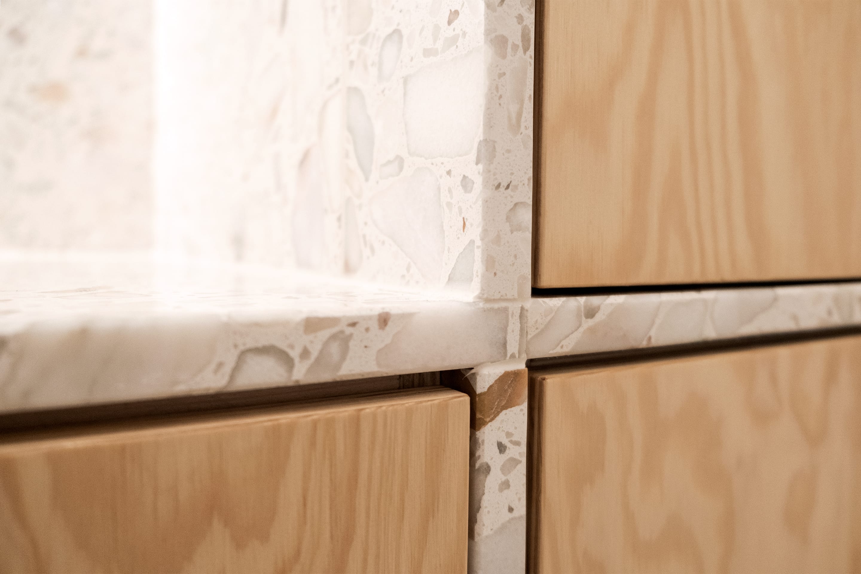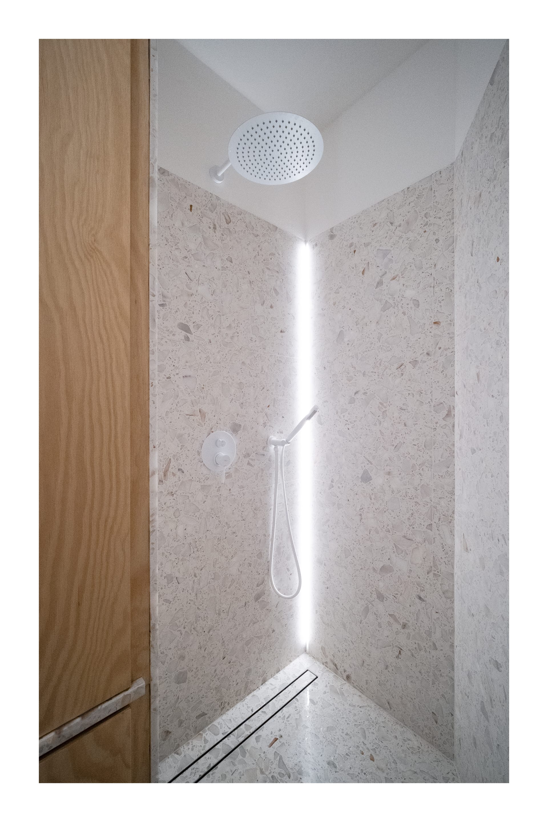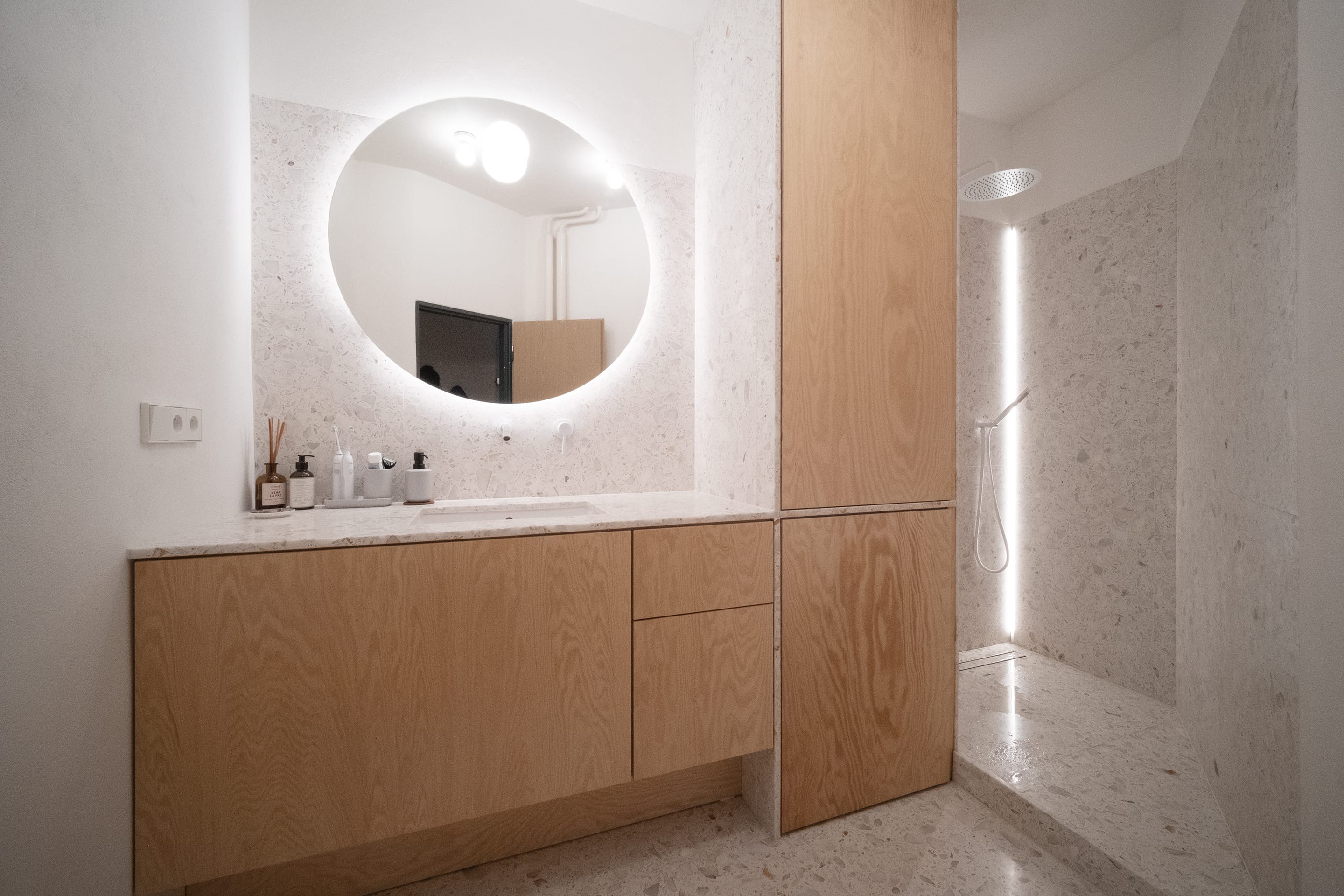 Koupelna byla přeorientována tak, aby obsahovala tři zóny: prostor s umyvadlem, vysokou vestavěnou skříň s pračkou a za ní skrytý sprchový kout. Důraz byl kladen na minimalistický design s bohatými texturami. Proto bylo pro dlažbu, obklady i umyvadlovou desku zvoleno terrazzo, které kontrastně doplňují dvířka z borové překližky. Omítky, koncové prvky a armatury jsou bílé, aby nenápadně zapadaly do celkového designu. Veškeré úložné prostory, včetně pračky, byly skryté. Glazované keramické stropní objímky doplňuje atmosférické LED osvětlení za zrcadlem a ve sprchovém koutě.