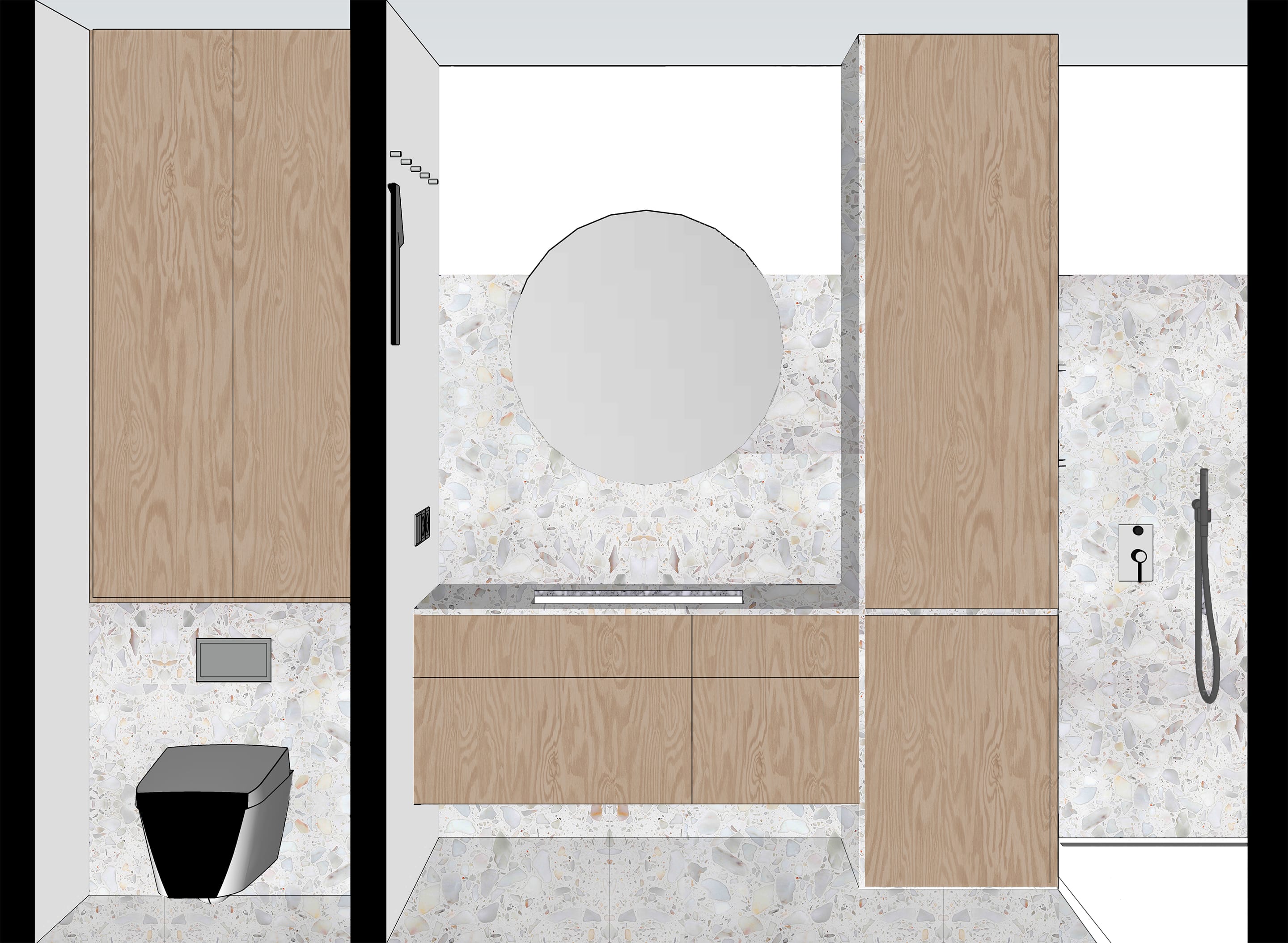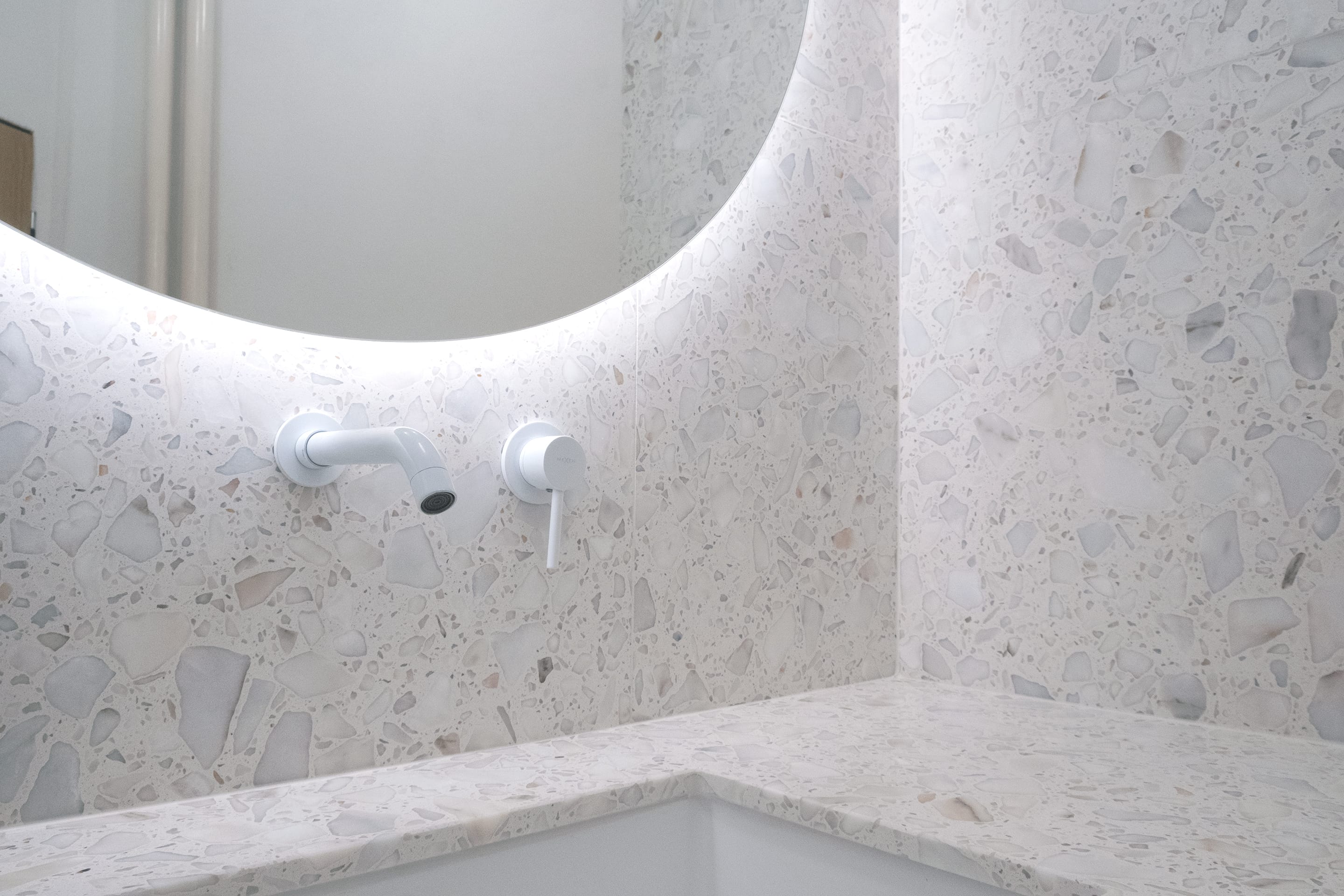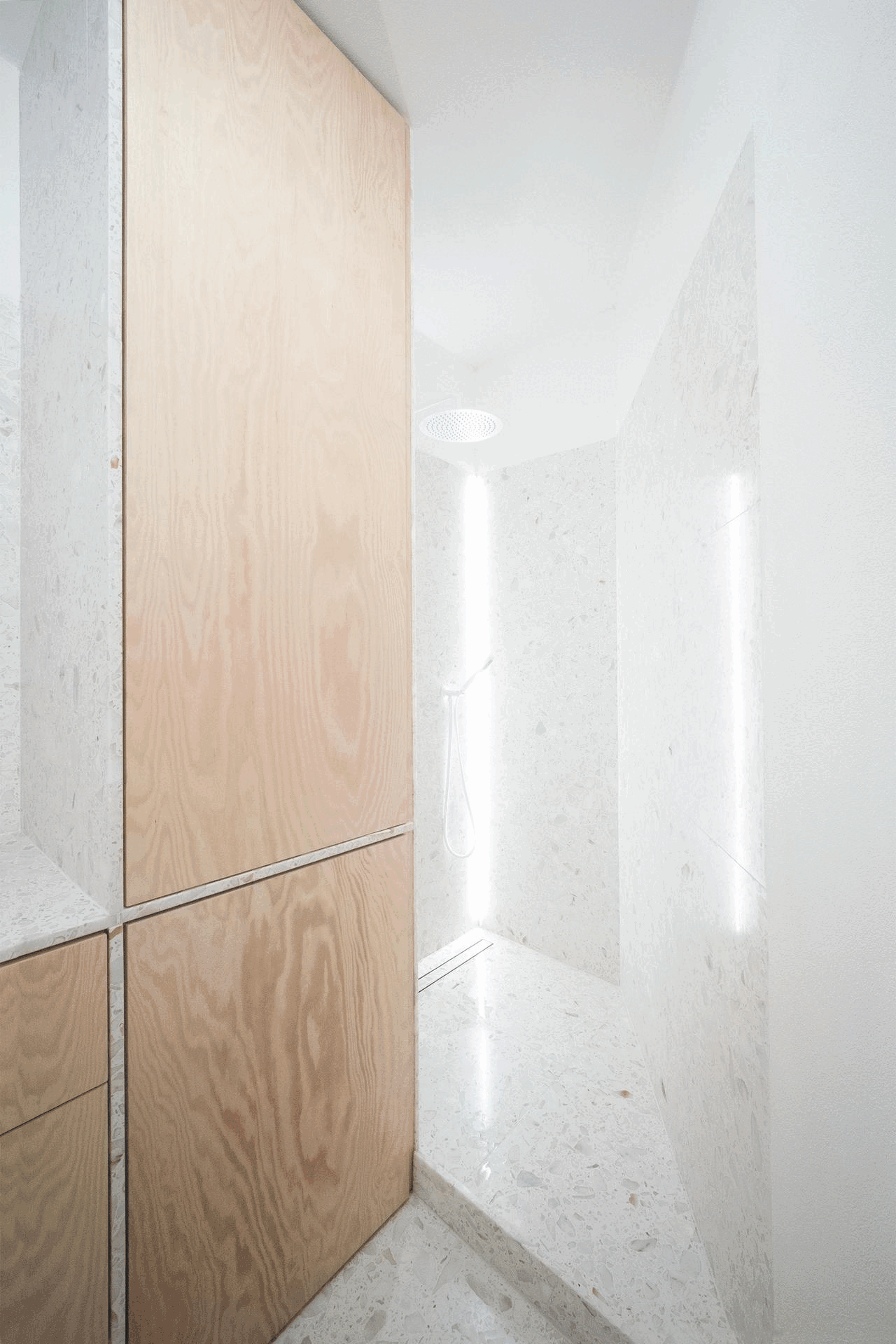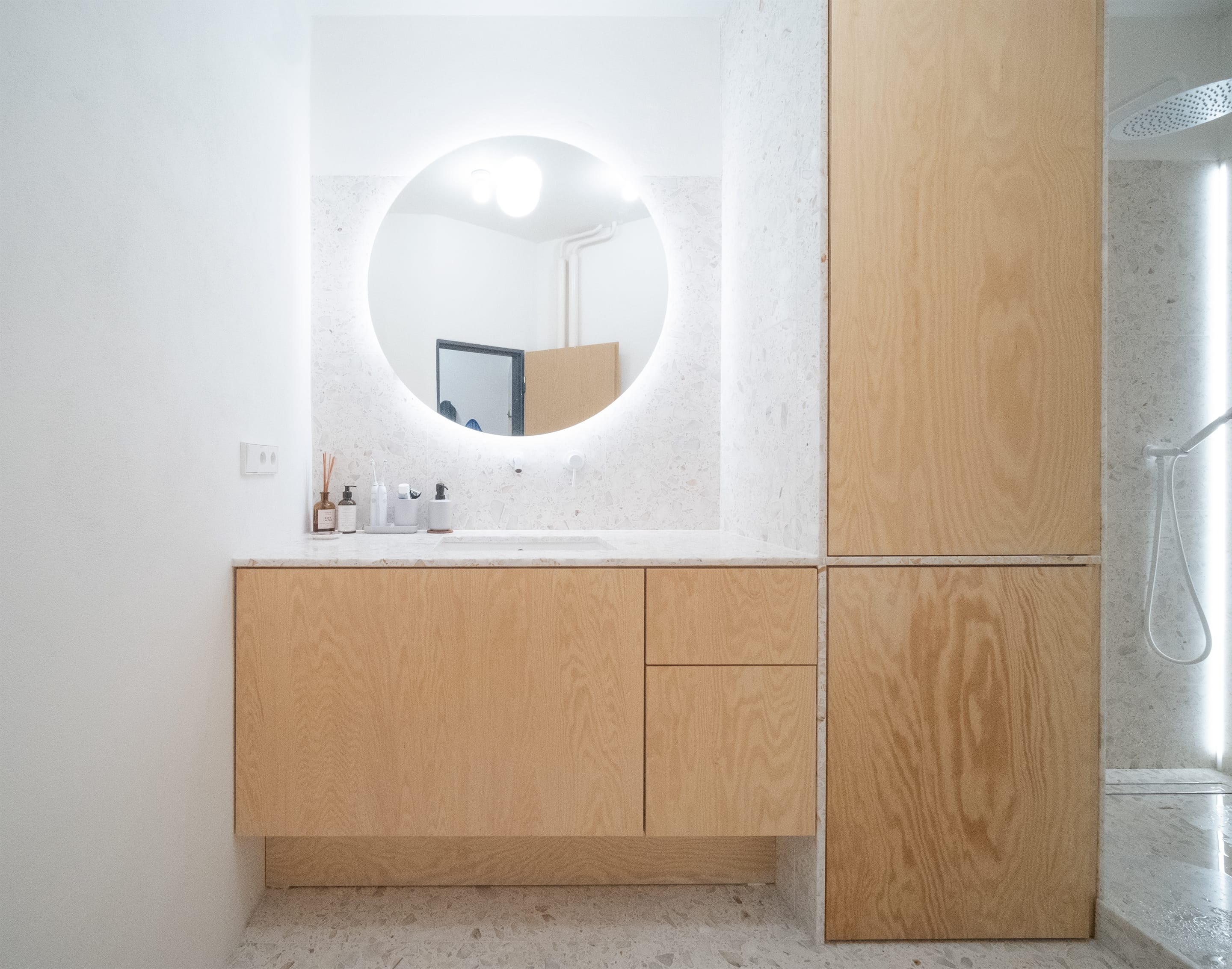 Koupelna byla přeorientována tak, aby obsahovala tři zóny: prostor s umyvadlem, vysokou vestavěnou skříň s pračkou a za ní skrytý sprchový kout. Důraz byl kladen na minimalistický design s bohatými texturami. Proto bylo pro dlažbu, obklady i umyvadlovou desku zvoleno terrazzo, které kontrastně doplňují dvířka z borové překližky. Omítky, koncové prvky a armatury jsou bílé, aby nenápadně zapadaly do celkového designu. Veškeré úložné prostory, včetně pračky, byly skryté. Glazované keramické stropní objímky doplňuje atmosférické LED osvětlení za zrcadlem a ve sprchovém koutě.
