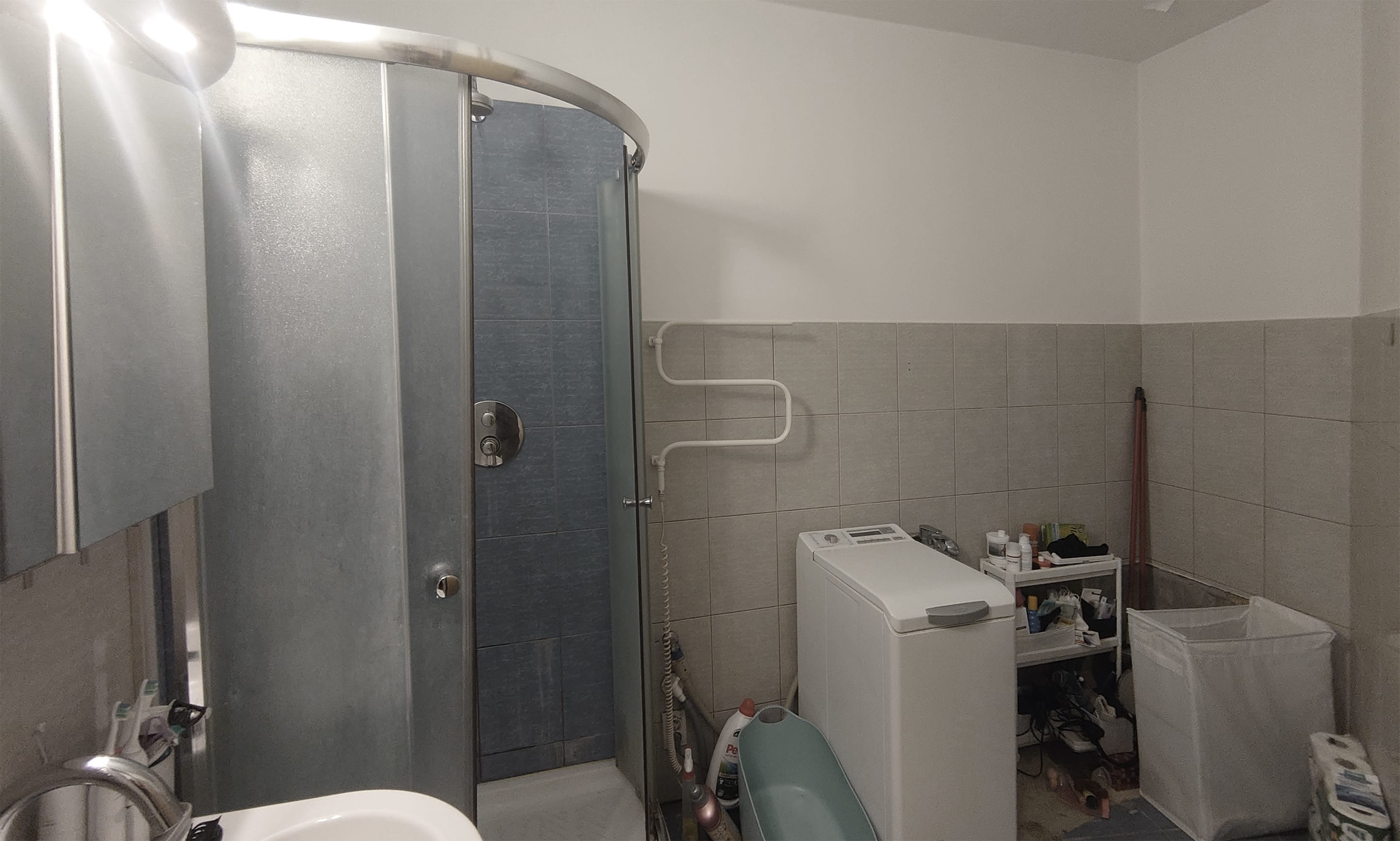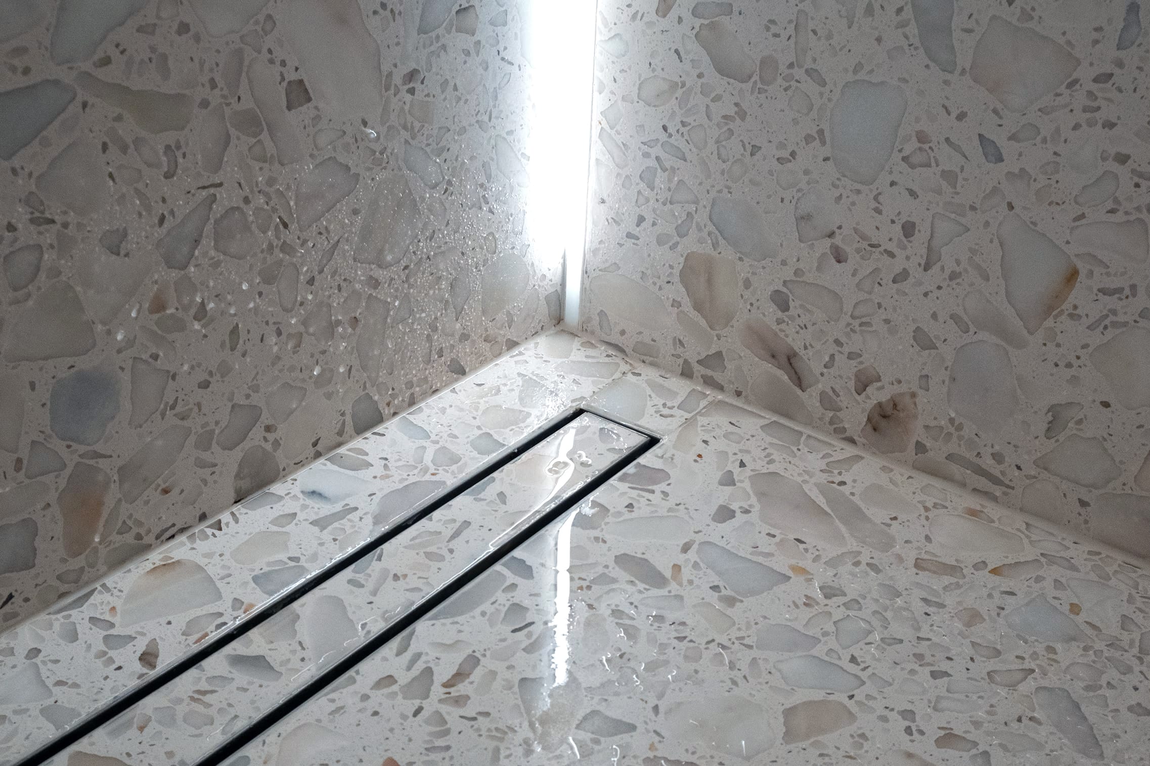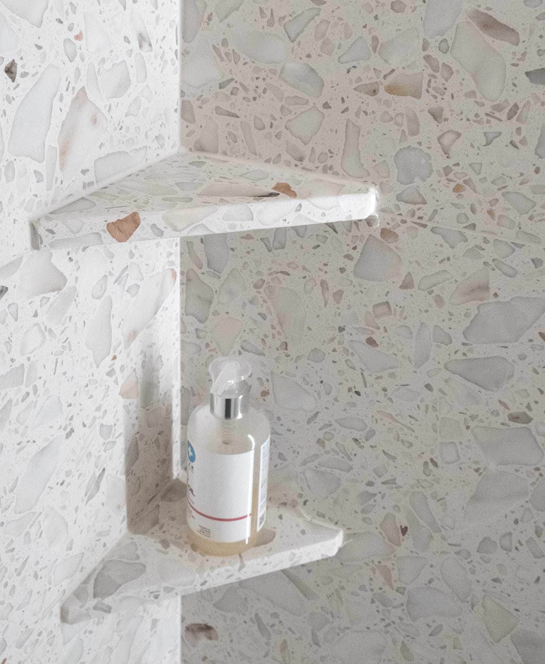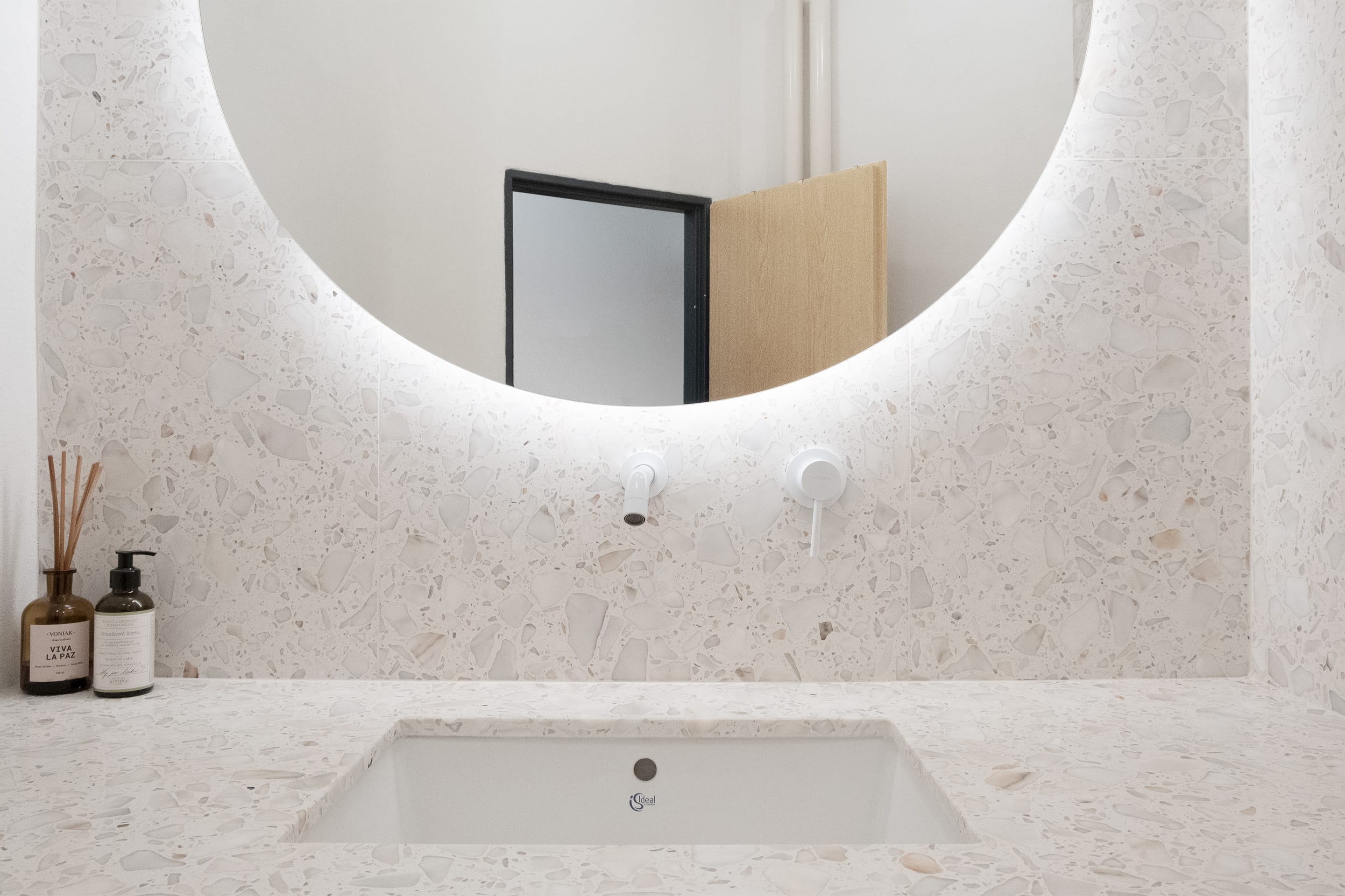 Koupelna byla přeorientována tak, aby obsahovala tři zóny: prostor s umyvadlem, vysokou vestavěnou skříň s pračkou a za ní skrytý sprchový kout. Důraz byl kladen na minimalistický design s bohatými texturami. Proto bylo pro dlažbu, obklady i umyvadlovou desku zvoleno terrazzo, které kontrastně doplňují dvířka z borové překližky. Omítky, koncové prvky a armatury jsou bílé, aby nenápadně zapadaly do celkového designu. Veškeré úložné prostory, včetně pračky, byly skryté. Glazované keramické stropní objímky doplňuje atmosférické LED osvětlení za zrcadlem a ve sprchovém koutě.