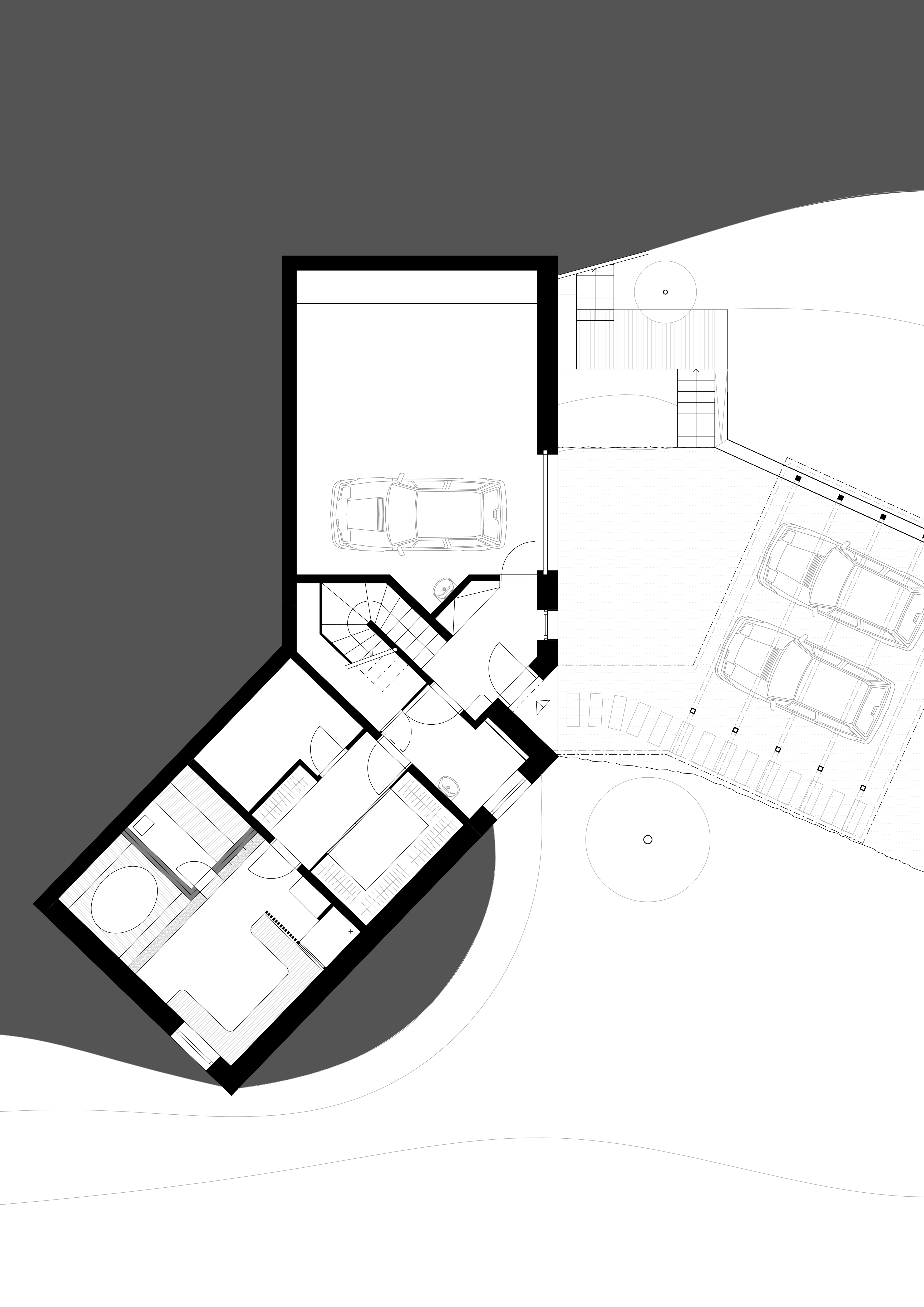 The western facade is supplemented by a 3 metre wide terrace that will bridge indoor and outdoor activities. The exposed eastern part of the basement is flanked by a green roof carport simultaneously functioning as an entrance roof. Both are connected through a subtle path that winds around the object.