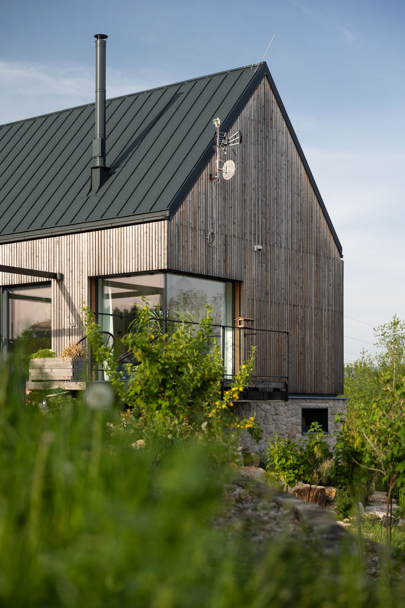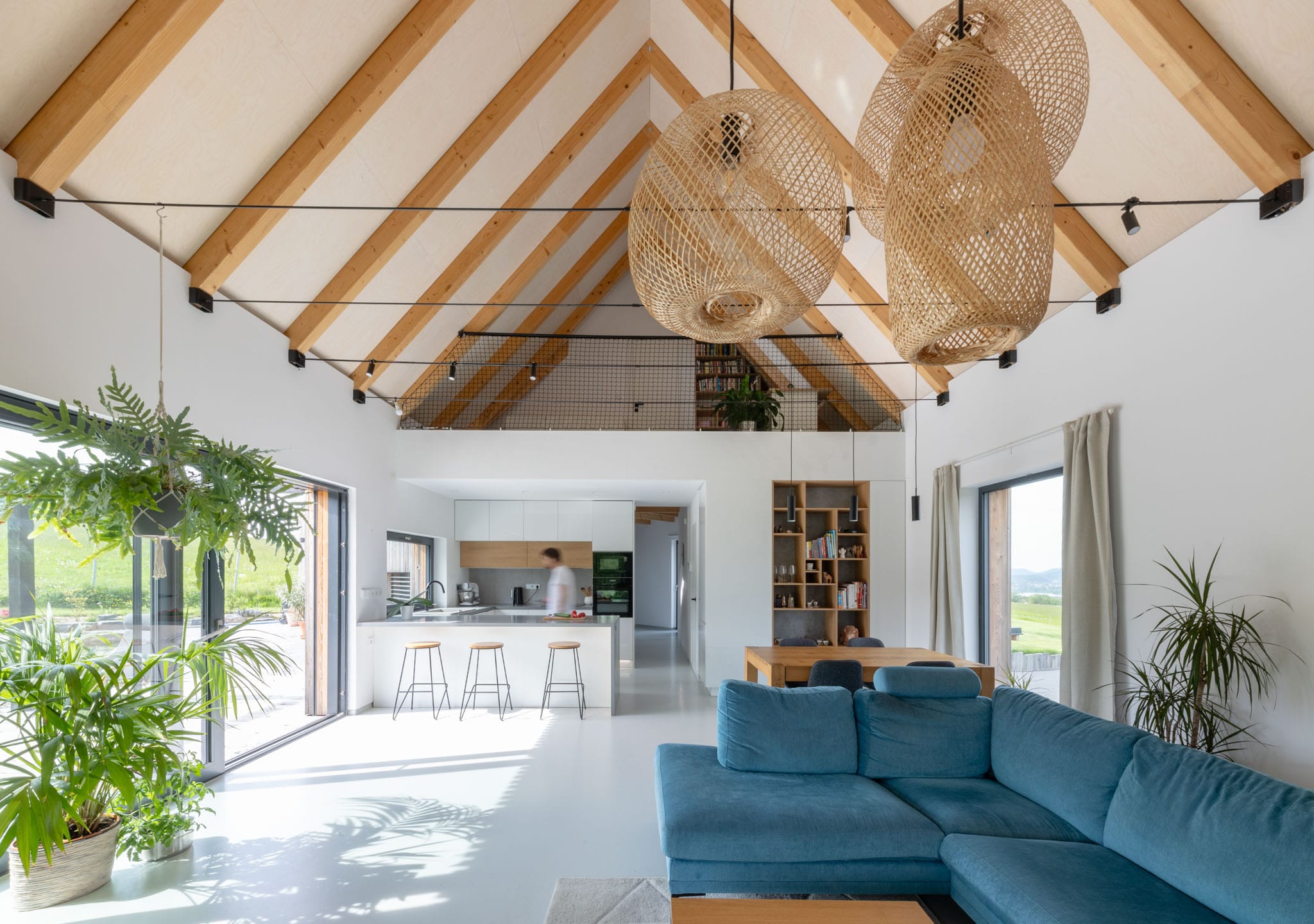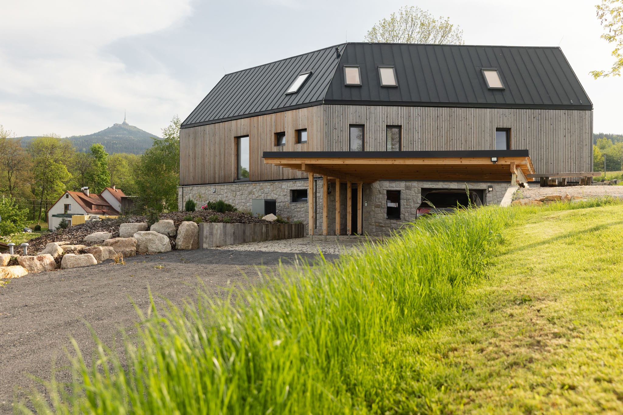 The house is situated in the hilly rural areas of Liberec on a site that offered a panoramic view on Ještěd - the mountain that dominates the whole region and is topped by the iconic TV tower designed by Karel Hubáček. The site itself is surrounded by historic rural barns and traditionally shaped family houses, a fact which needed to be respected. Due to the sloping terrain and proximity of neighbouring buildings to the south and high voltage electricity poles to the east, the house opens up its interiors to the west, leaving only narrow windows on its eastern facade.
