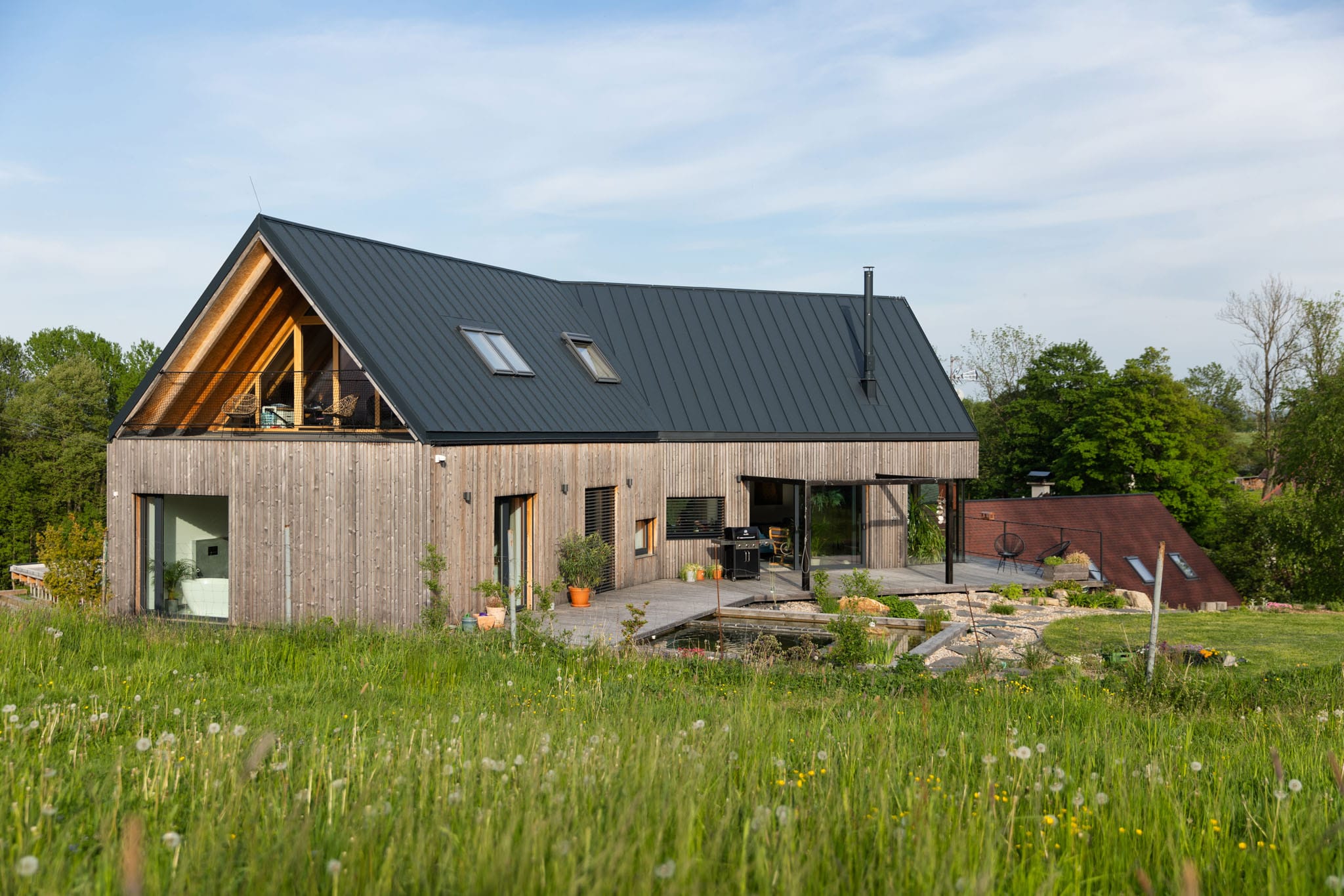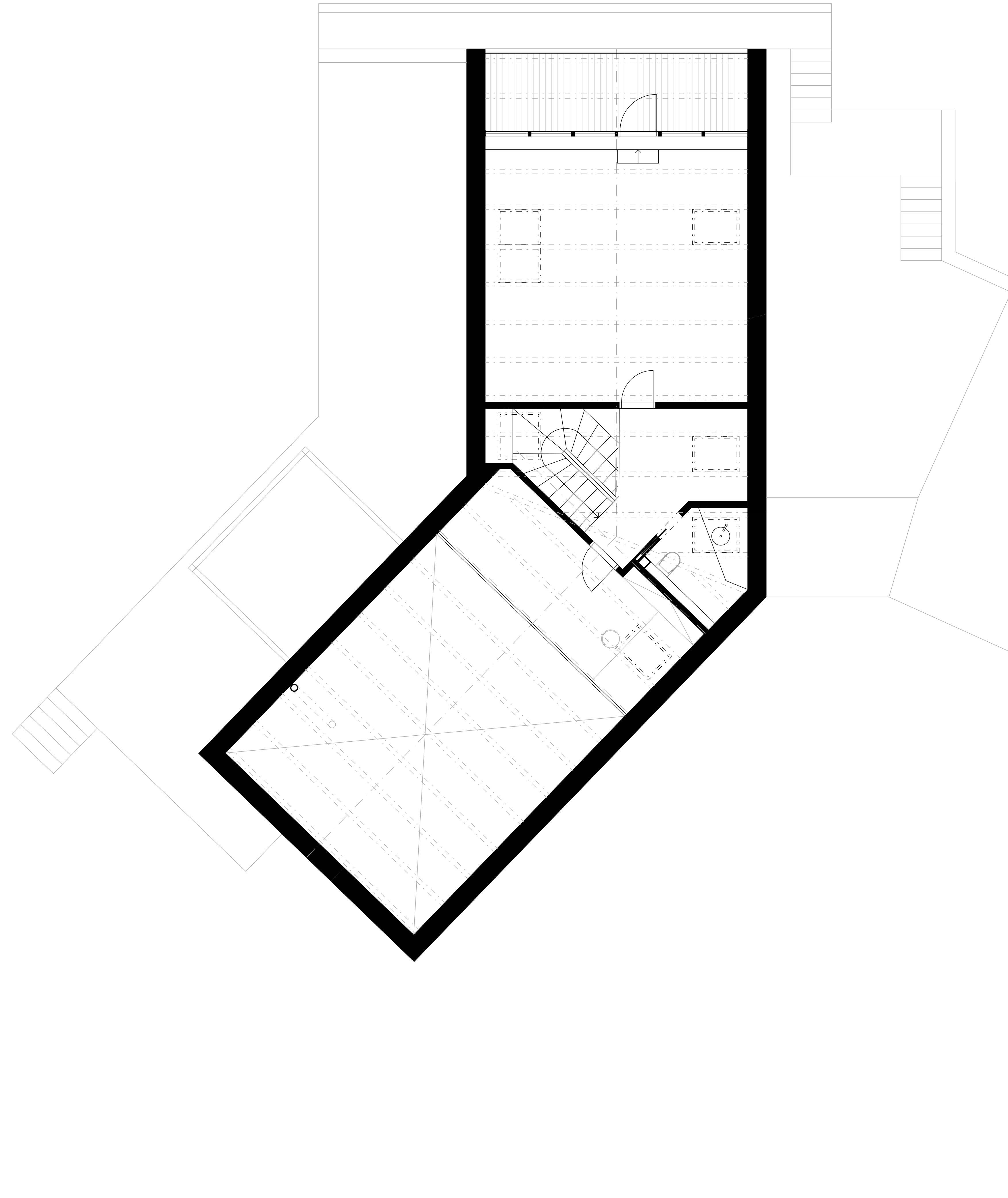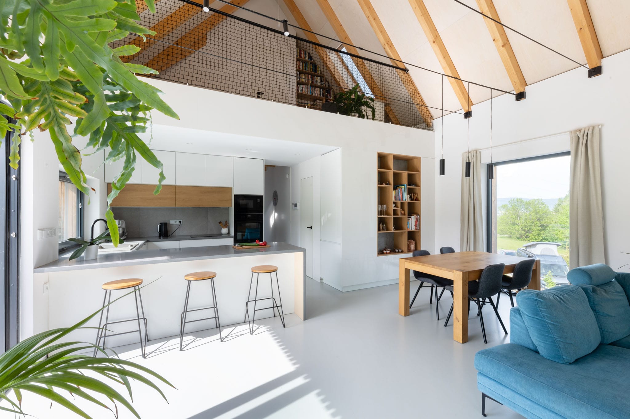The house is situated in the hilly rural areas of Liberec on a site that offered a panoramic view on Ještěd - the mountain that dominates the whole region and is topped by the iconic TV tower designed by Karel Hubáček. The site itself is surrounded by historic rural barns and traditionally shaped family houses, a fact which needed to be respected. Due to the sloping terrain and proximity of neighbouring buildings to the south and high voltage electricity poles to the east, the house opens up its interiors to the west, leaving only narrow windows on its eastern facade.