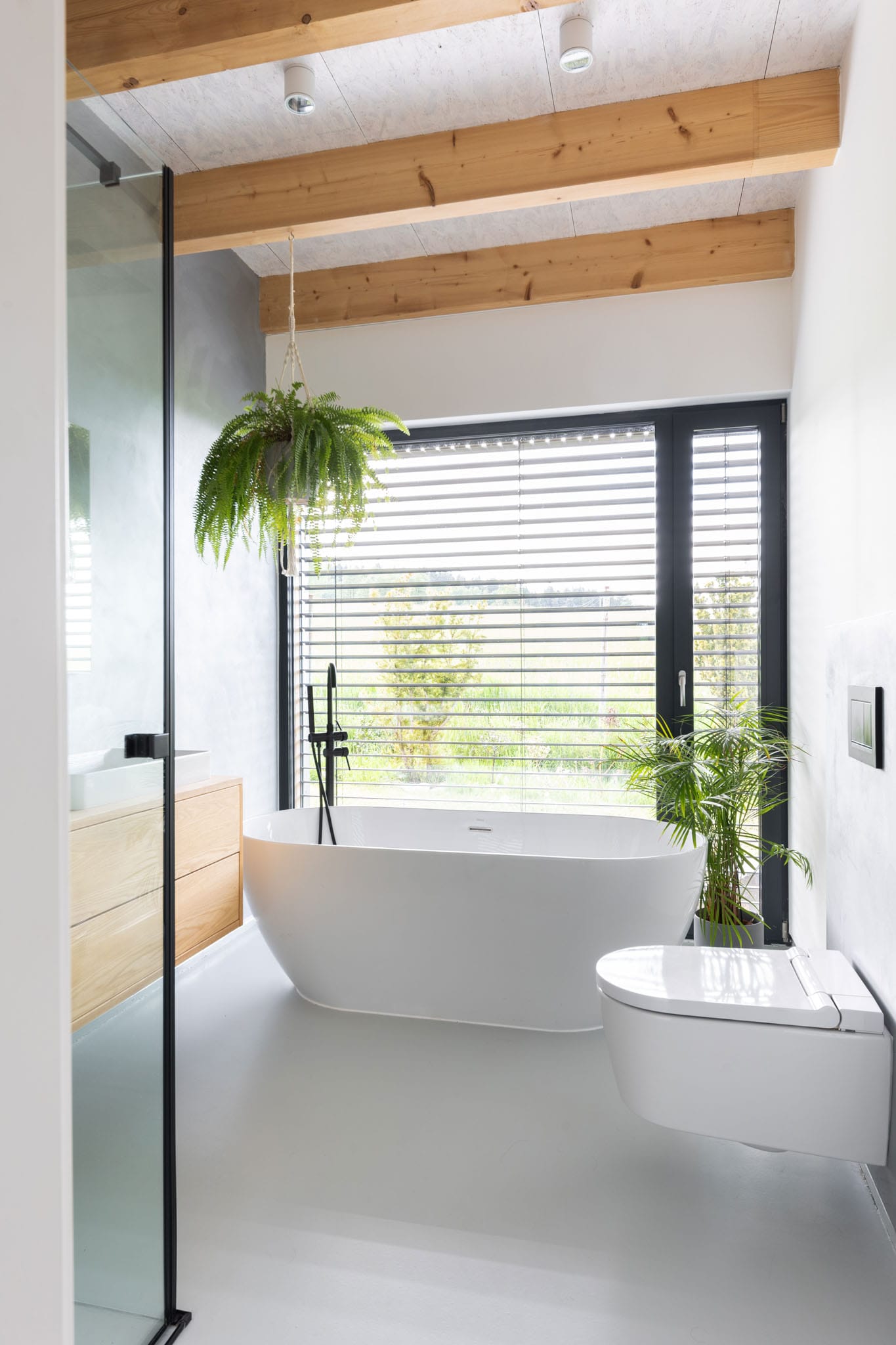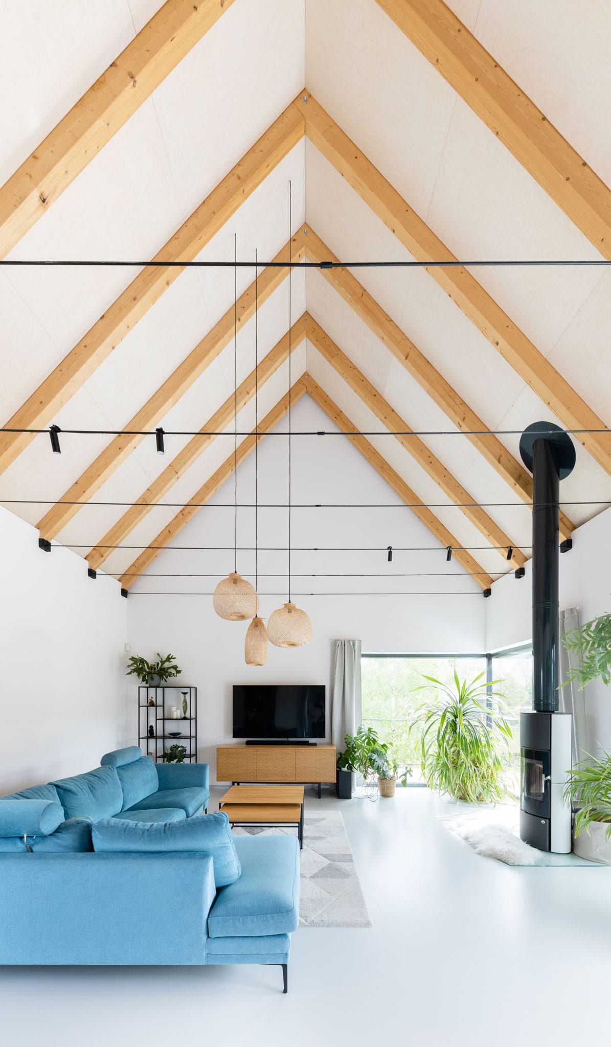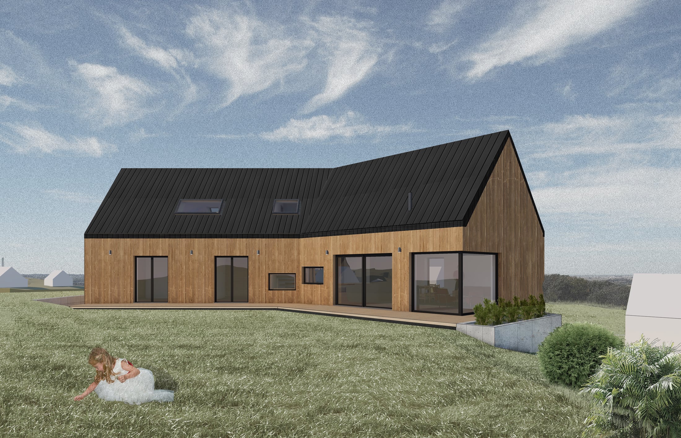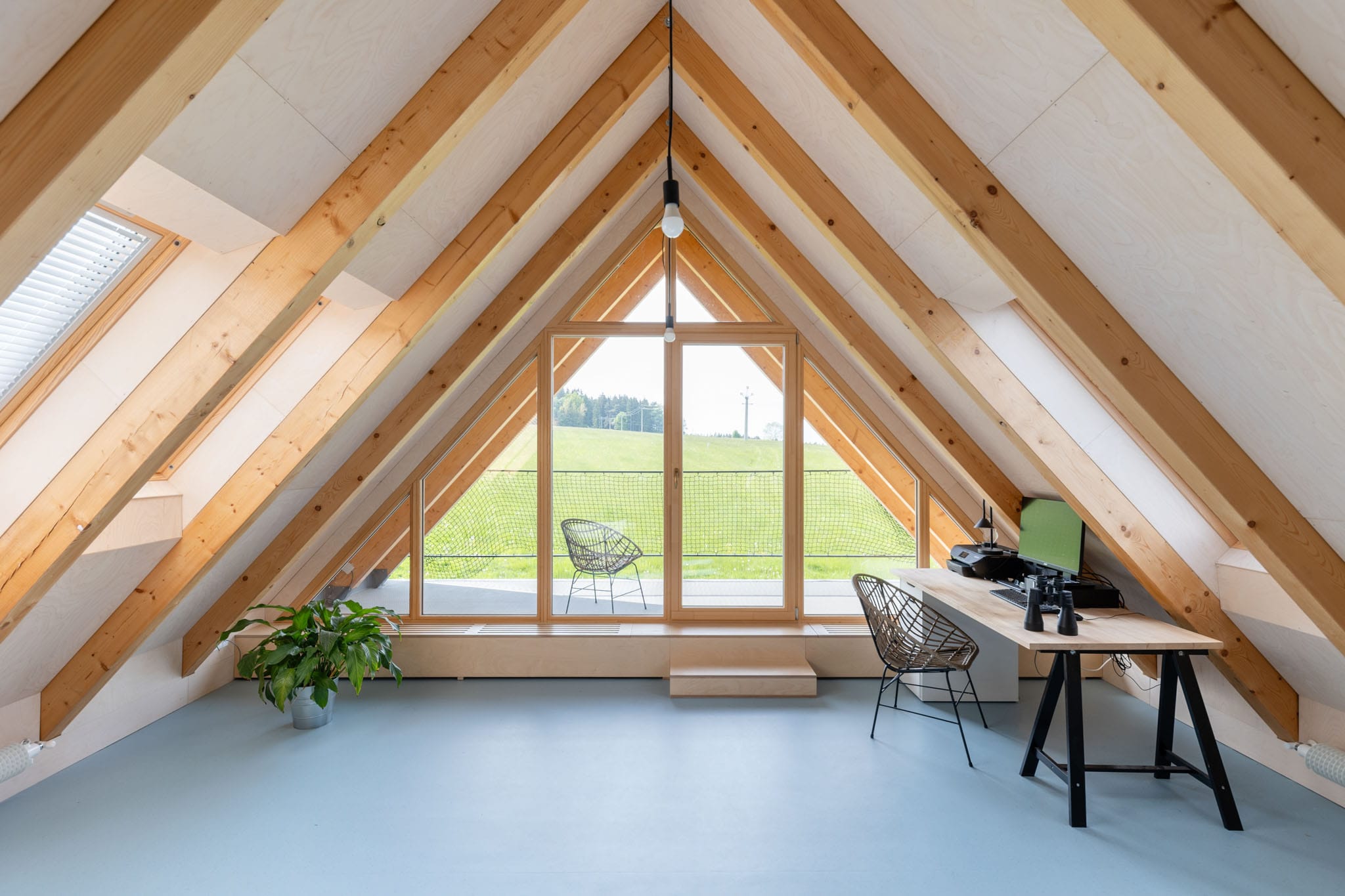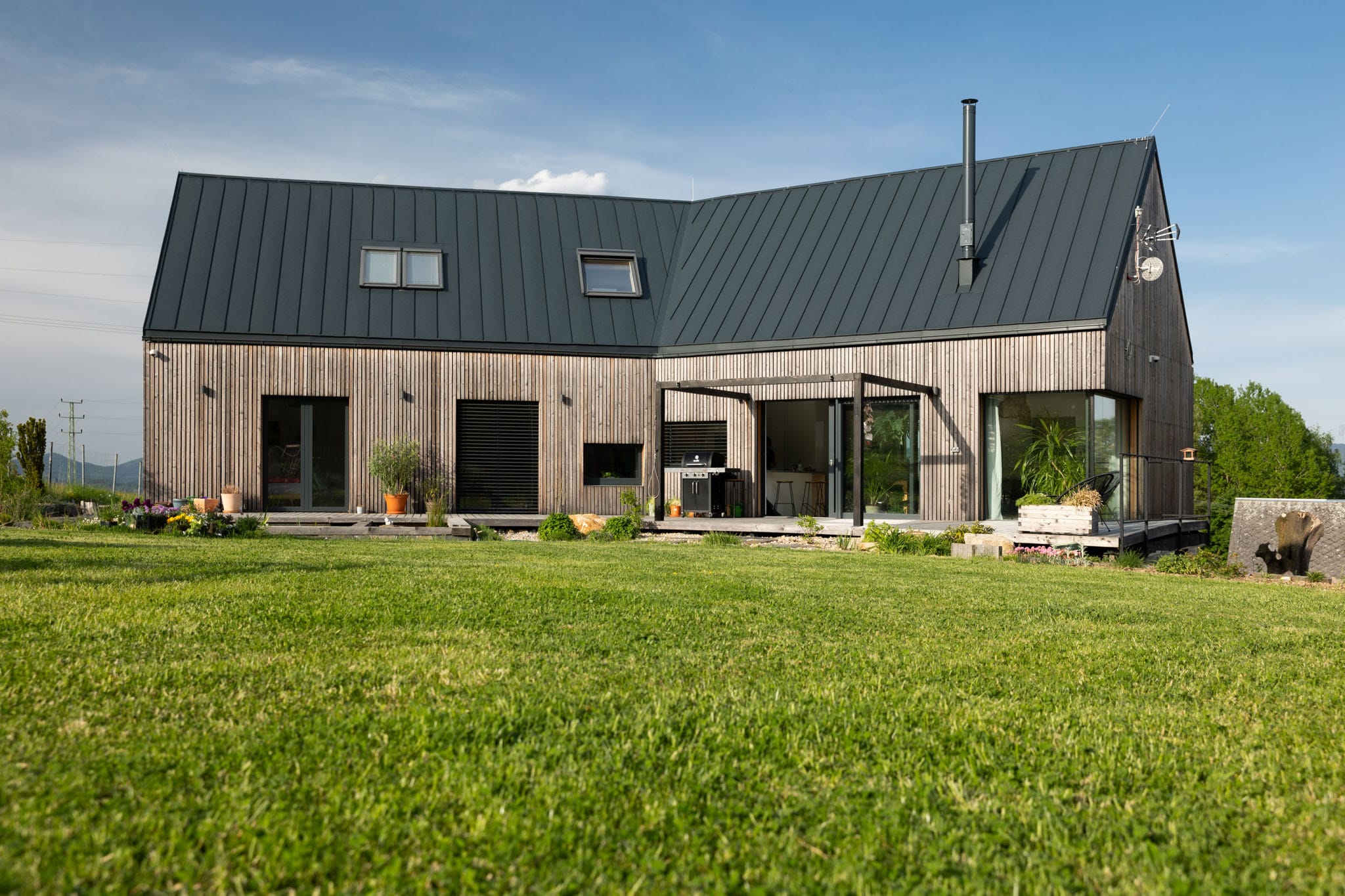 In order to accommodate all important living areas into the ground floor on the narrow site and orient them towards the panoramic view, the floor plan footprint was folded into a V-shape, while in its volume still retaining a gable roof geometry that is predominant to the area.