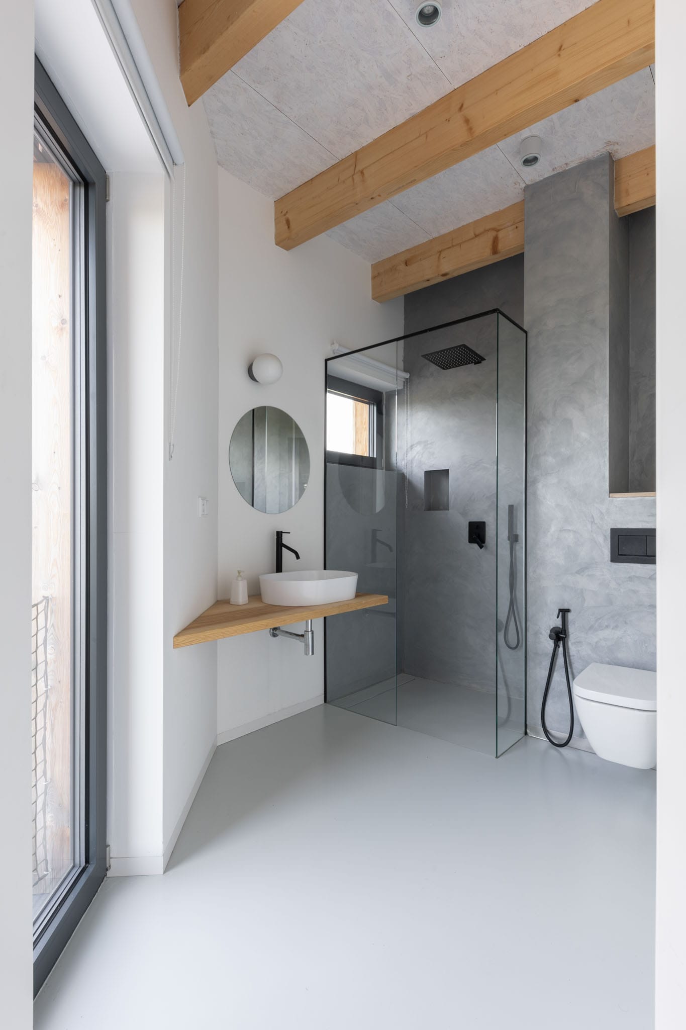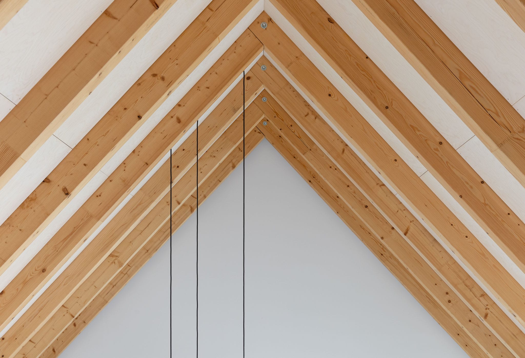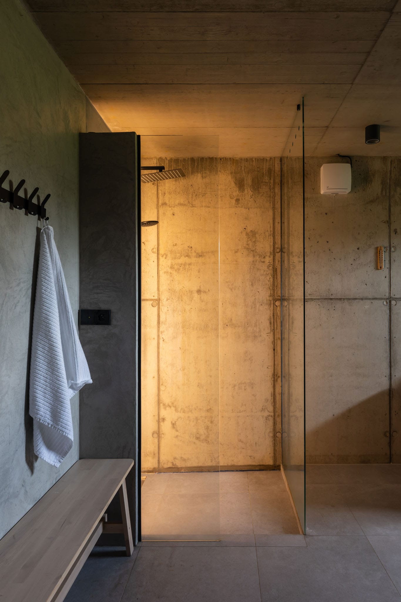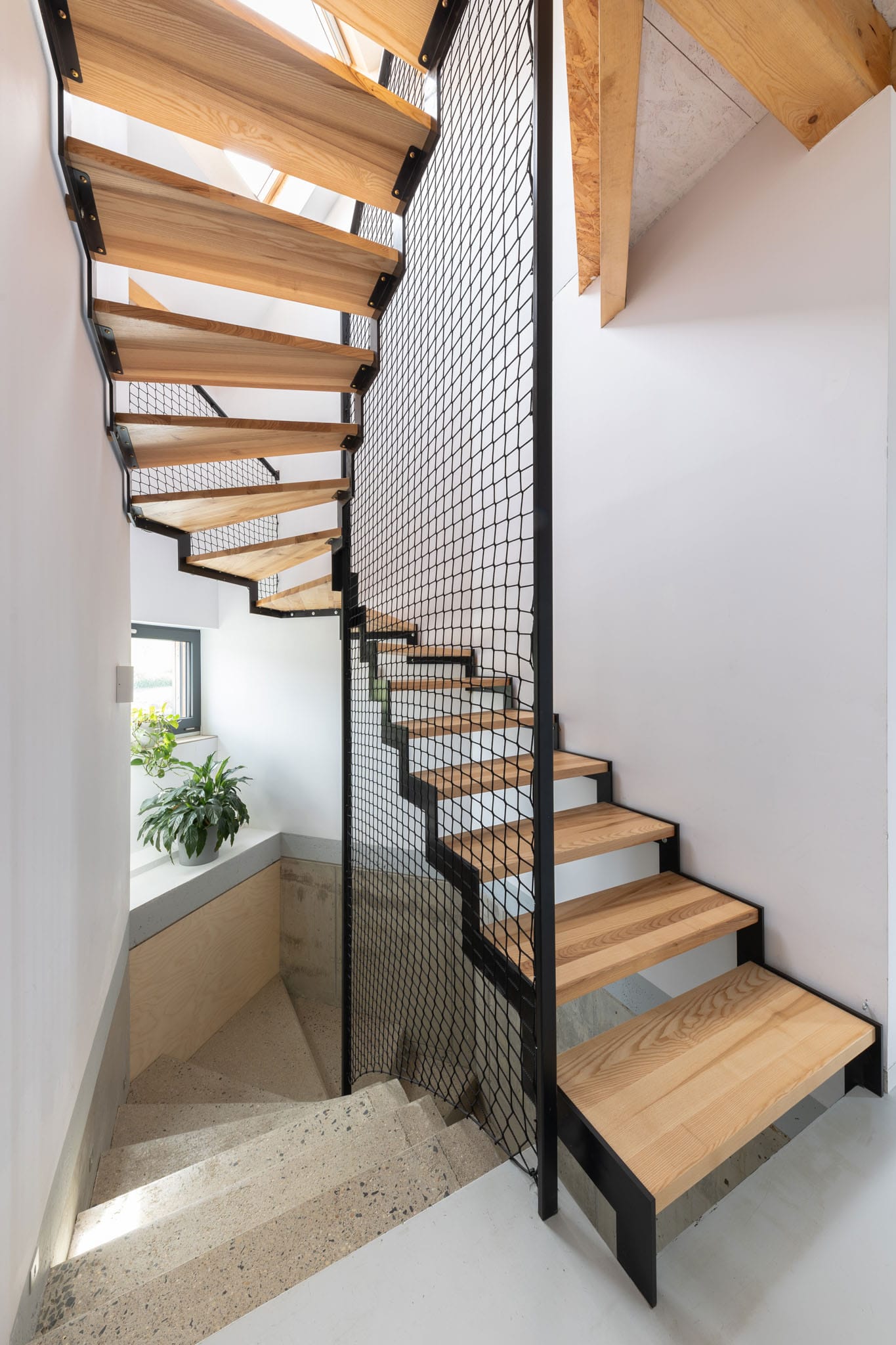 The three floors are divided into the beton-brut walled lower level, which is partially recessed into the terrain and clad with a stone wall on its exterior to fuse with the terrain and soften the height of the house on it's eastern facade, and the upper level and attic which inhibit the wooden structure and reflect local heritage architecture through the use of larch planks clad vertically.