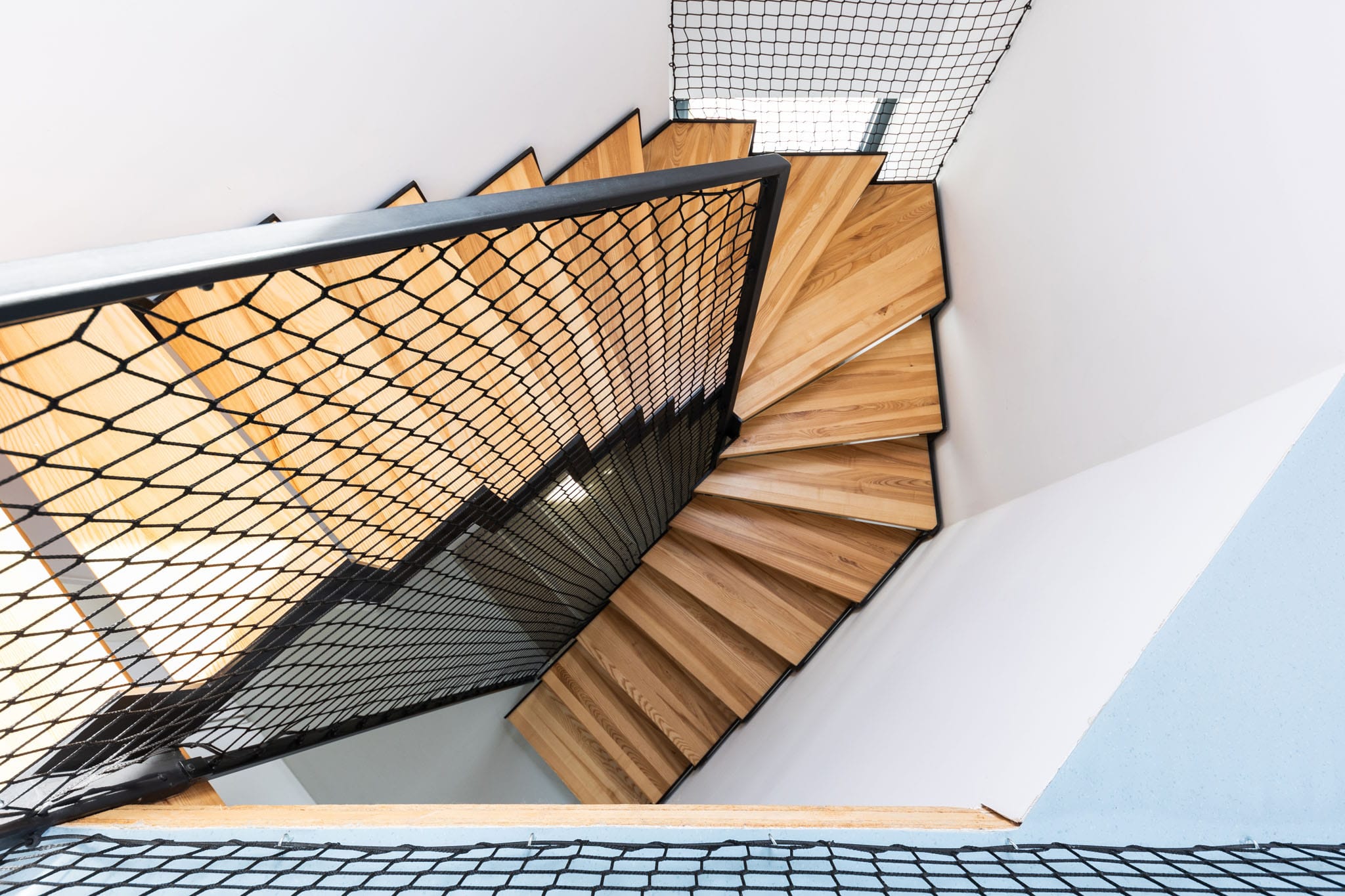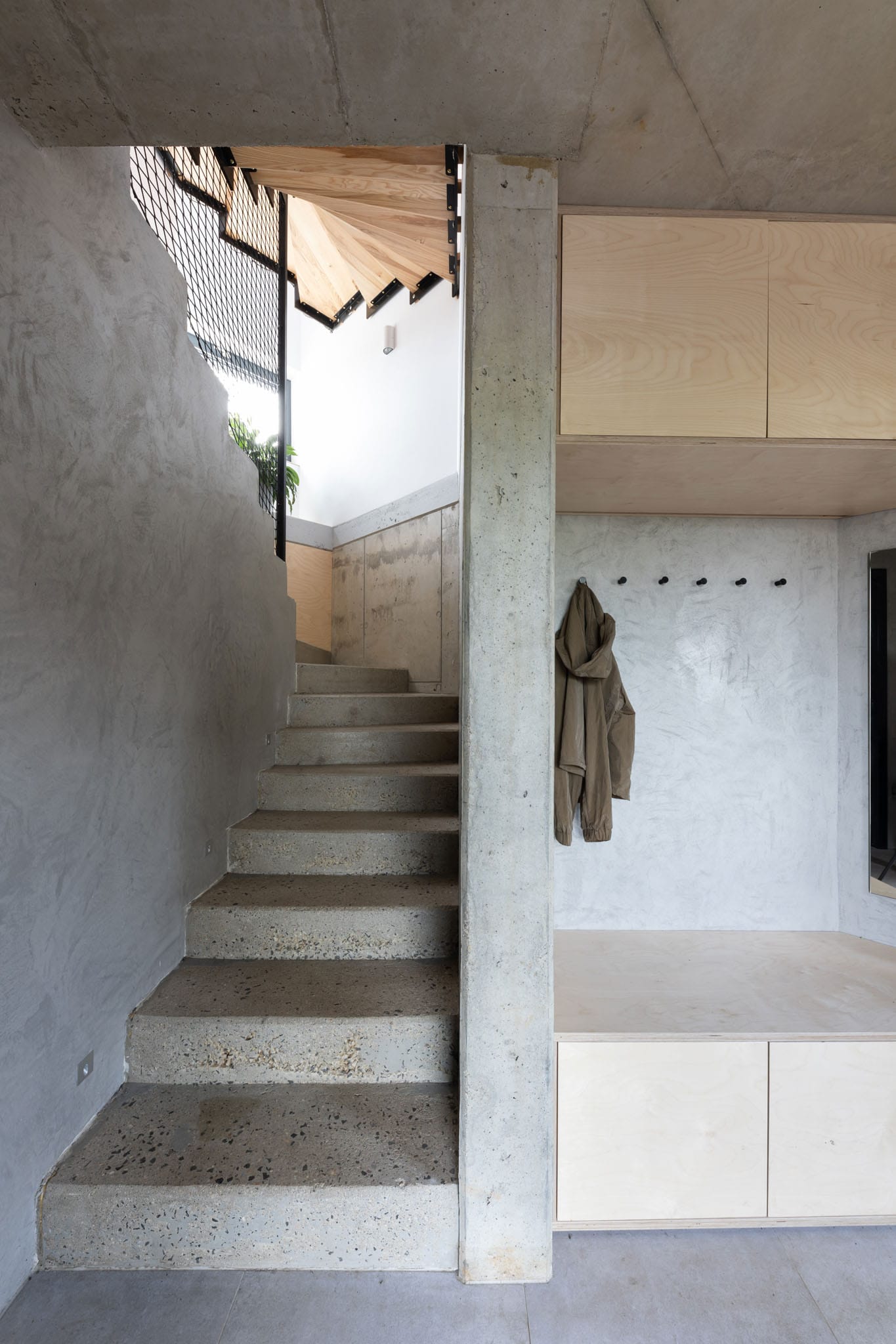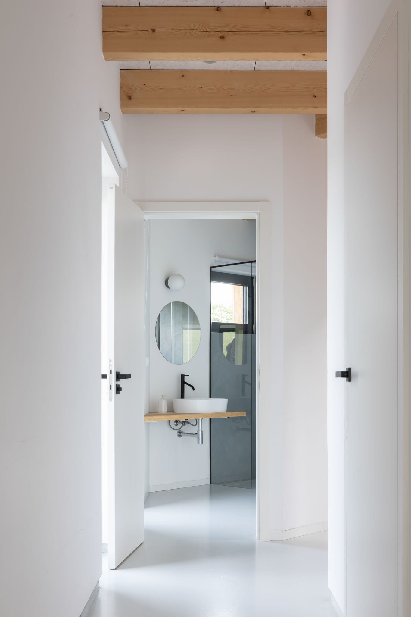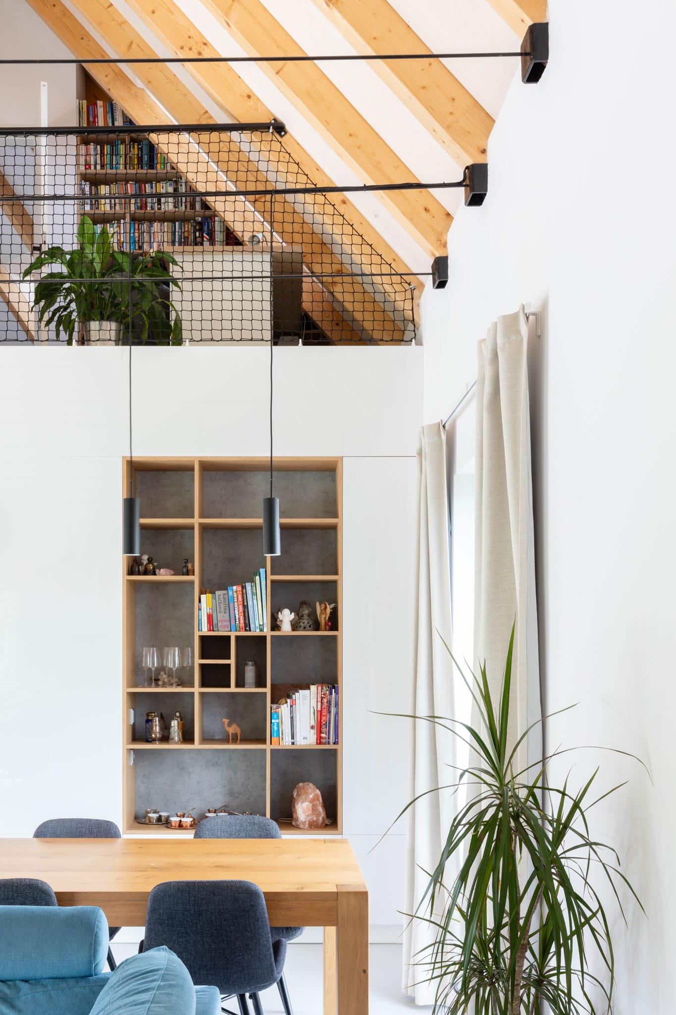 The three floors are divided into the beton-brut walled lower level, which is partially recessed into the terrain and clad with a stone wall on its exterior to fuse with the terrain and soften the height of the house on it's eastern facade, and the upper level and attic which inhibit the wooden structure and reflect local heritage architecture through the use of larch planks clad vertically.