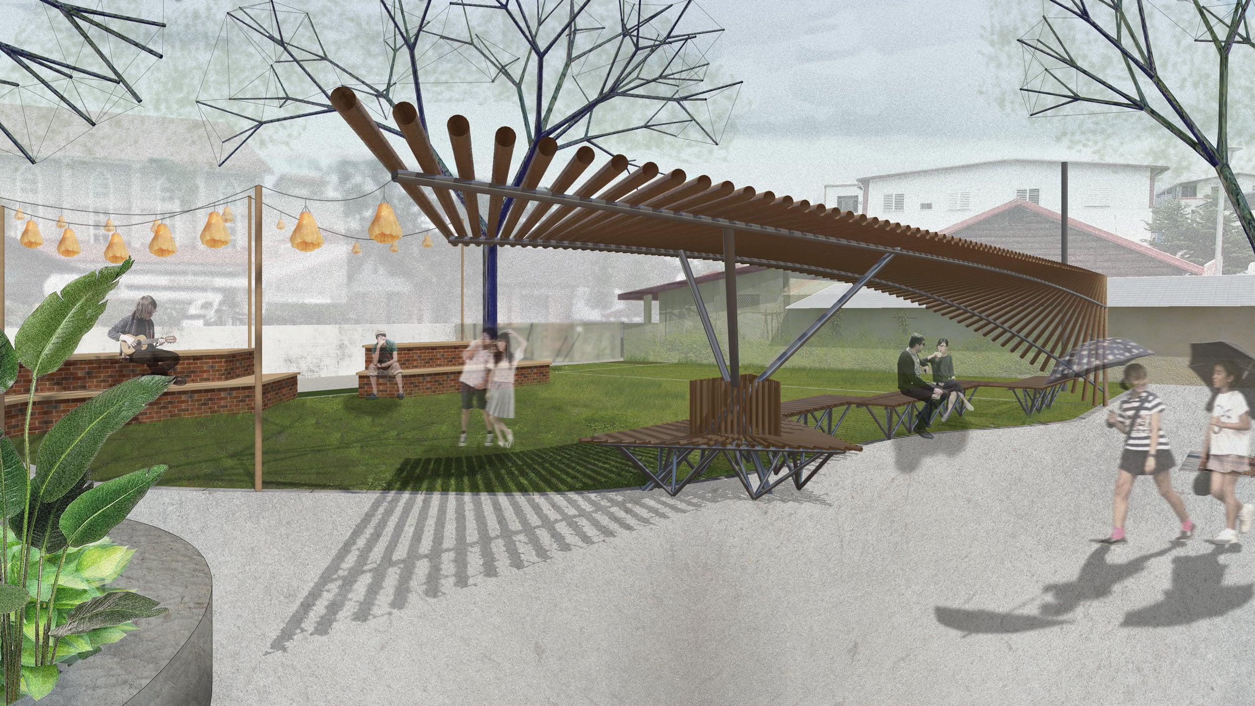 The project tries to reflect typical elements and materials that can be found in throughout the town of Guanshan and other Taiwanese small small towns: Omnipresent bamboo poles and trees, subtle steel truss frameworks and corrugated steel shapes typical for Taiwanese DIY house extensions, brick walls of abandoned buildings from the early 20th century and loofah lanterns, which are a local speciality.
