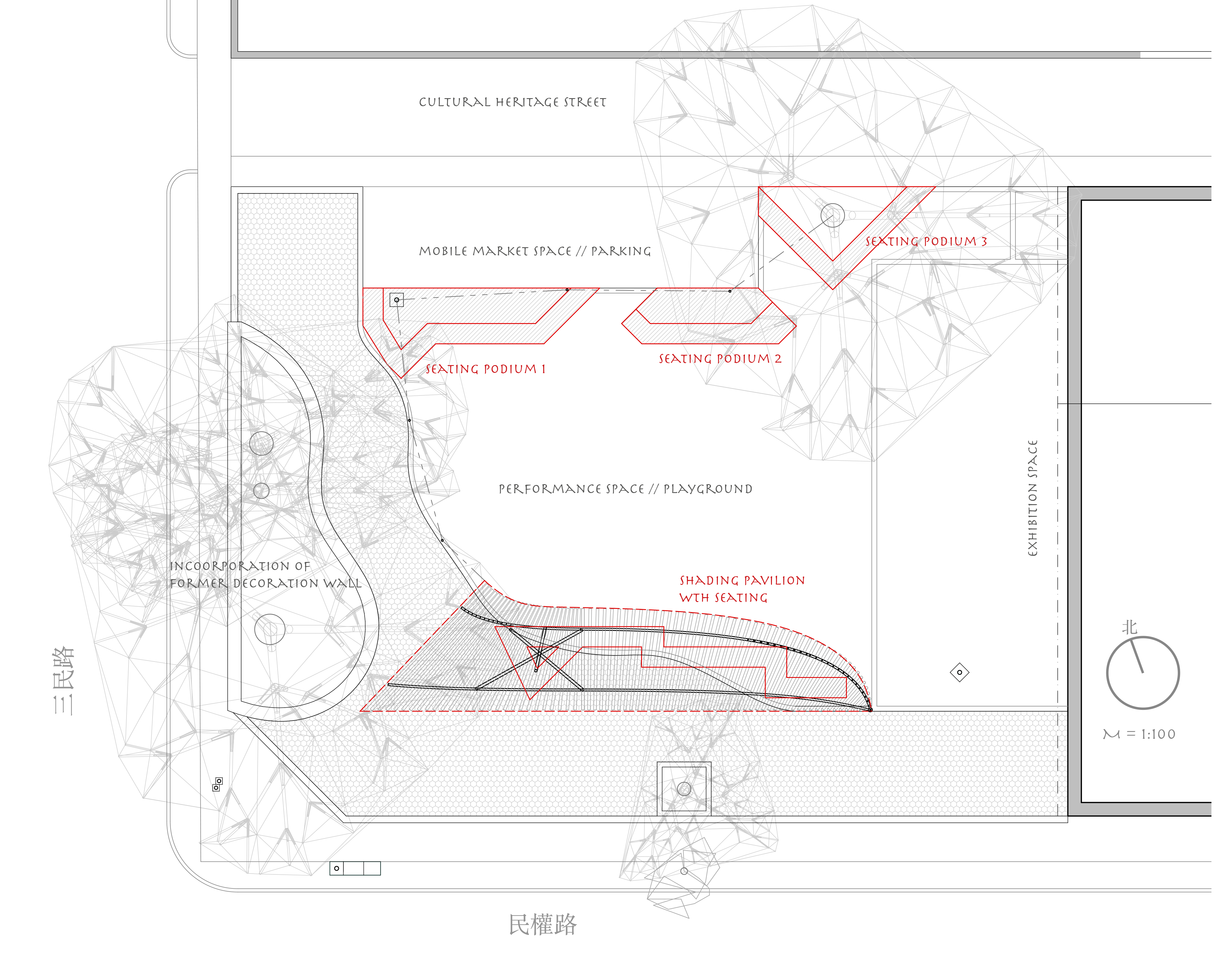 As the little park with its surrounding historical buildings provided a natural kind of stage, the project tries to accentuate it by encircling it with seating and shading elements. The principle idea was a shape generated by a moving pole encircling the plaza - starting at the southside as a shading pavilion, twisting so that it would block the changing angle of the sunlight - turning into a vertical shape of lantern poles and finally evolving into low horizontal shapes in the northern part - creating seating podiums and market stands. The shading pavilion features a long bench copying the existing park outline and proving seating for both performances and passersby.